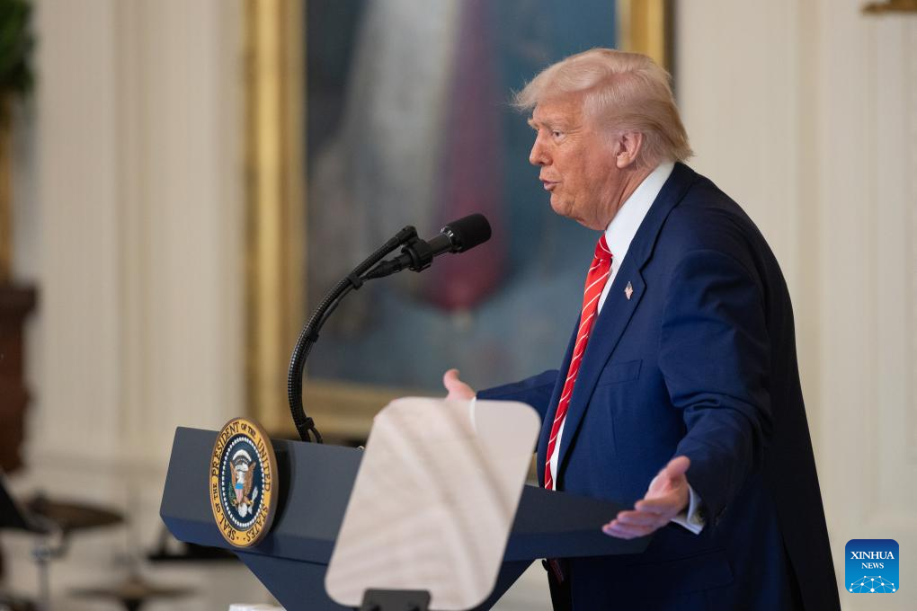 U.S. President Donald Trump speaks during a celebration of military mothers at the White House in Washington, D.C., the United States, on May 8, 2025. Trump on Thursday announced at the White House that the United States and Britain had reached a new trade agreement, which includes partially rolling back tariffs in certain sectors and further expanding market access for each other's products. (Xinhua/Hu Yousong)