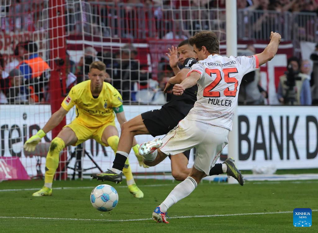 Bayern Munich's Thomas Mueller (front) shoots during the German first division Bundesliga football match between Bayern Munich and Borussia Moenchengladbach in Munich, Germany, May 10, 2025. (Photo by Philippe Ruiz/Xinhua)