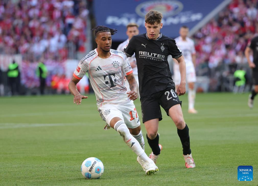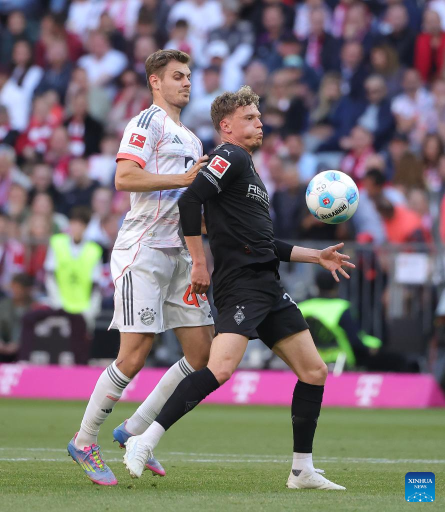 Bayern Munich's Josip Stanisic (L) vies with Moenchengladbach's Robin Hack during the German first division Bundesliga football match between Bayern Munich and Borussia Moenchengladbach in Munich, Germany, May 10, 2025. (Photo by Philippe Ruiz/Xinhua)