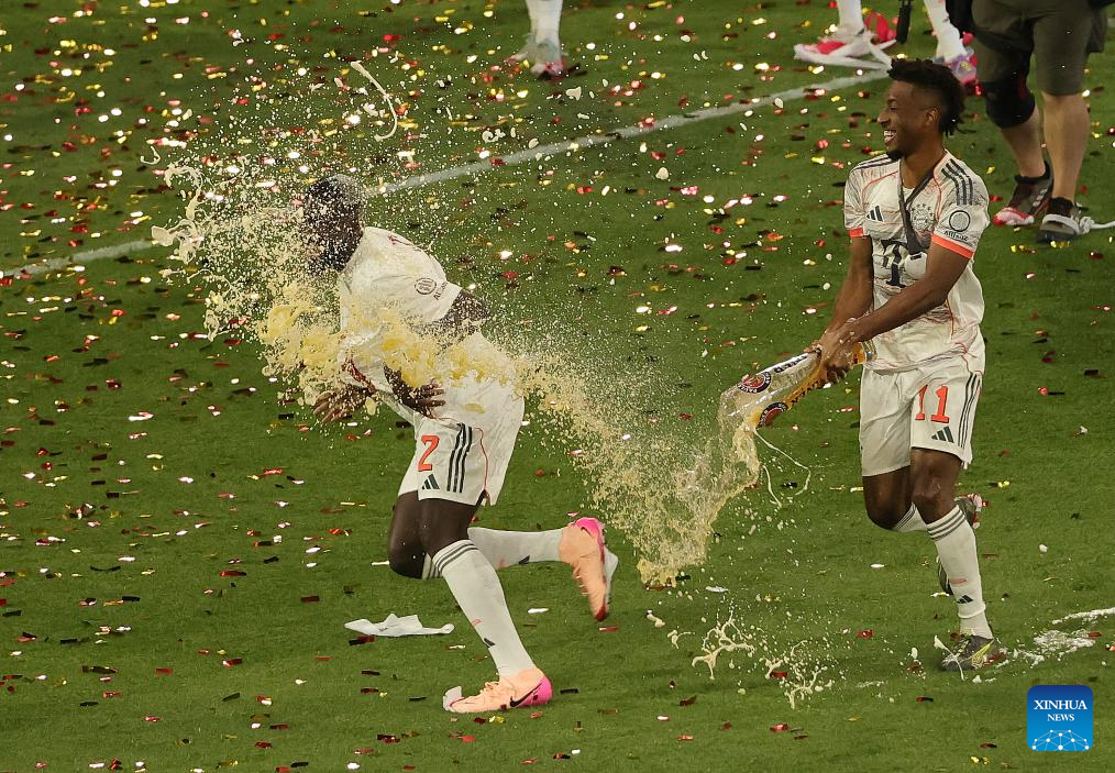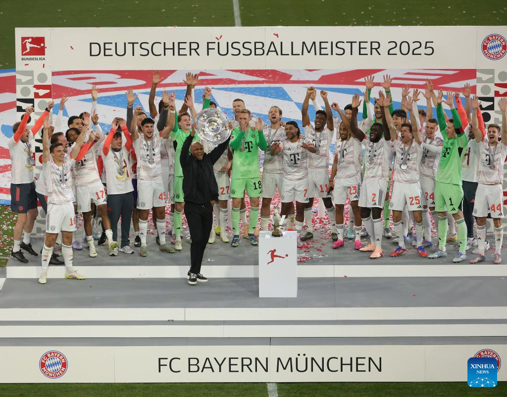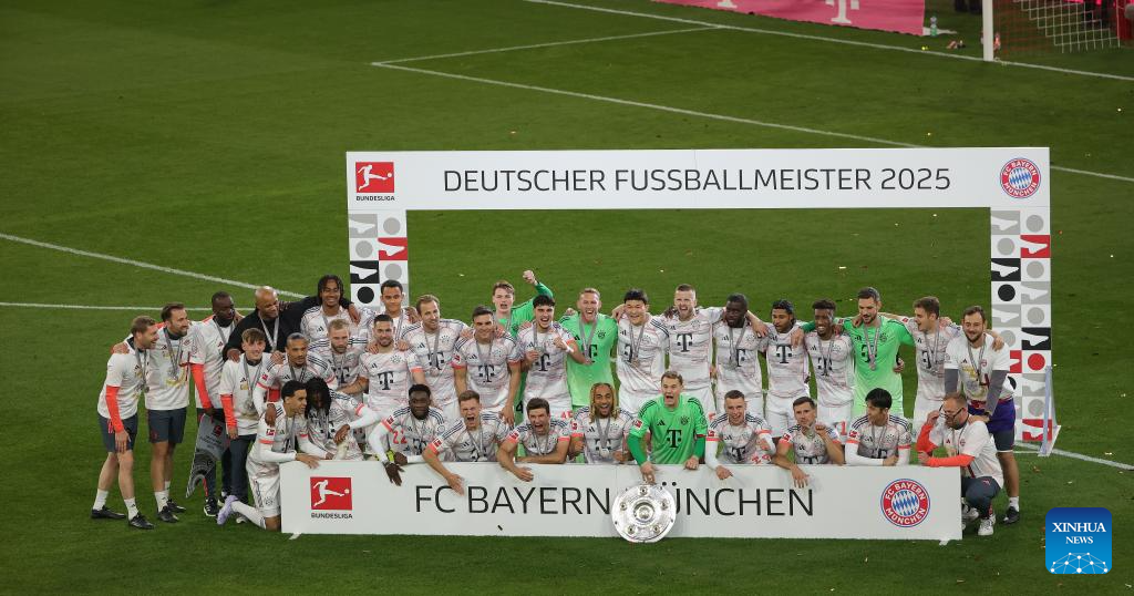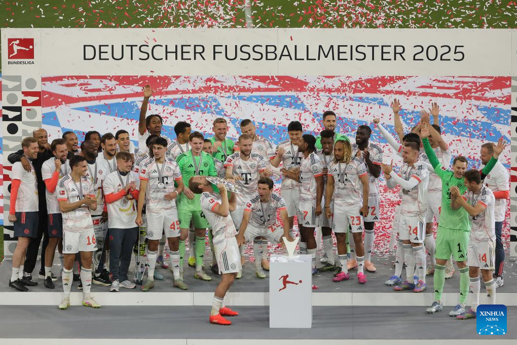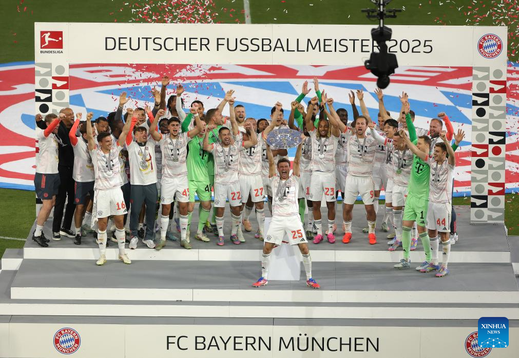 Members of Bayern Munich celebrate winning the Bundesliga title during the victory ceremony after the German first division Bundesliga football match between Bayern Munich and Borussia Moenchengladbach in Munich, Germany, May 10, 2025. (Photo by Philippe Ruiz/Xinhua)