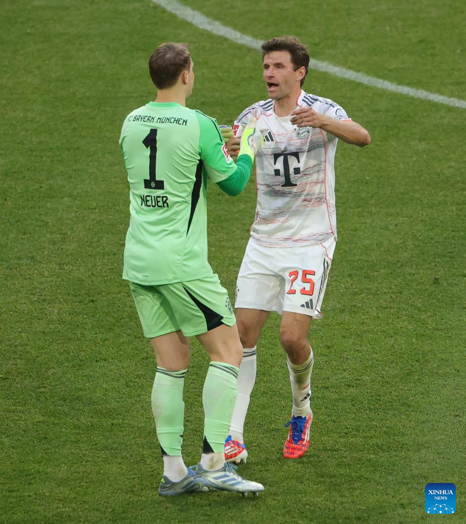 Bayern Munich's Thomas Mueller (R) gestures to his teammate Manuel Neuer before being substituted during the German first division Bundesliga football match between Bayern Munich and Borussia Moenchengladbach in Munich, Germany, May 10, 2025. (Photo by Philippe Ruiz/Xinhua)