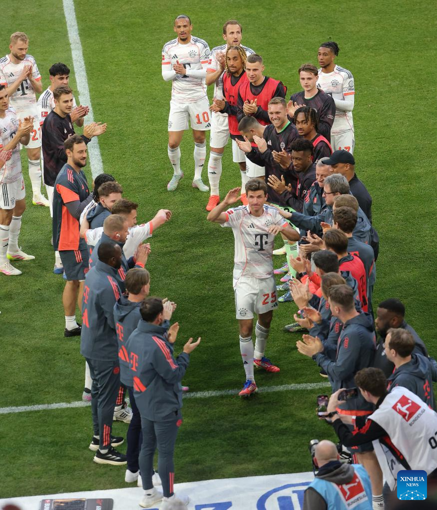 Bayern Munich's Thomas Mueller (C) gestures to his teammates before being substituted during the German first division Bundesliga football match between Bayern Munich and Borussia Moenchengladbach in Munich, Germany, May 10, 2025. (Photo by Philippe Ruiz/Xinhua)