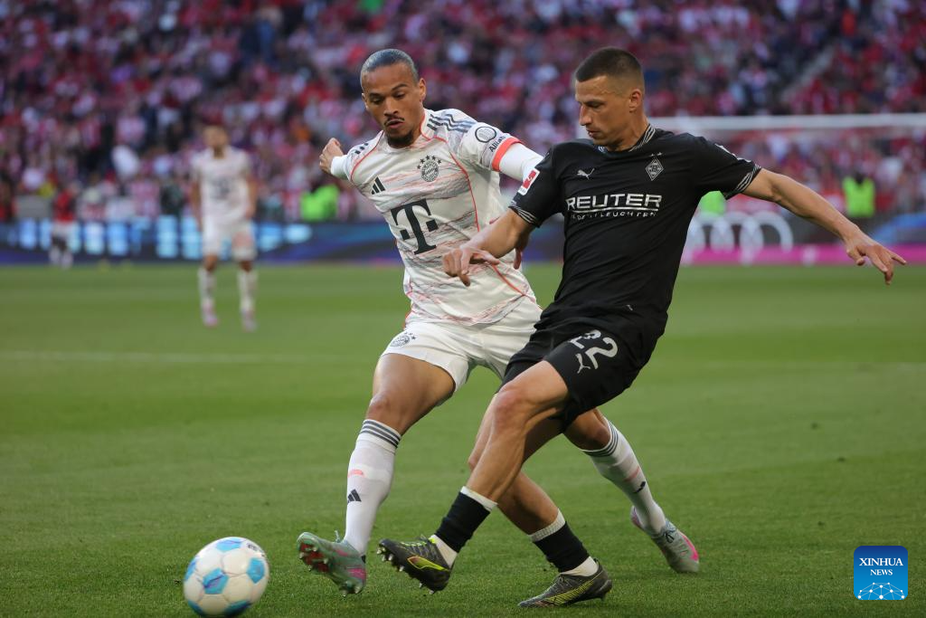 Bayern Munich's Leroy Sane (L) vies with Moenchengladbach's Stefan Lainer during the German first division Bundesliga football match between Bayern Munich and Borussia Moenchengladbach in Munich, Germany, May 10, 2025. (Photo by Philippe Ruiz/Xinhua)