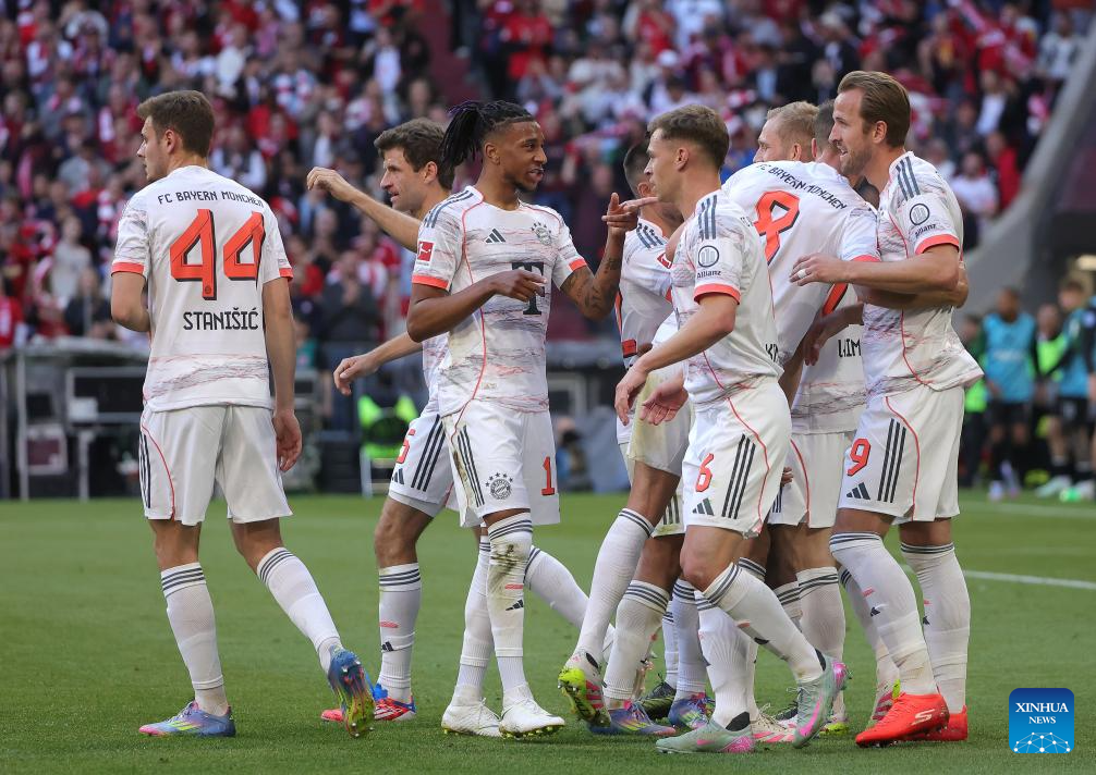 Bayern Munich's Harry Kane (1st R) celebrates his goal with teammates during the German first division Bundesliga football match between Bayern Munich and Borussia Moenchengladbach in Munich, Germany, May 10, 2025. (Photo by Philippe Ruiz/Xinhua)