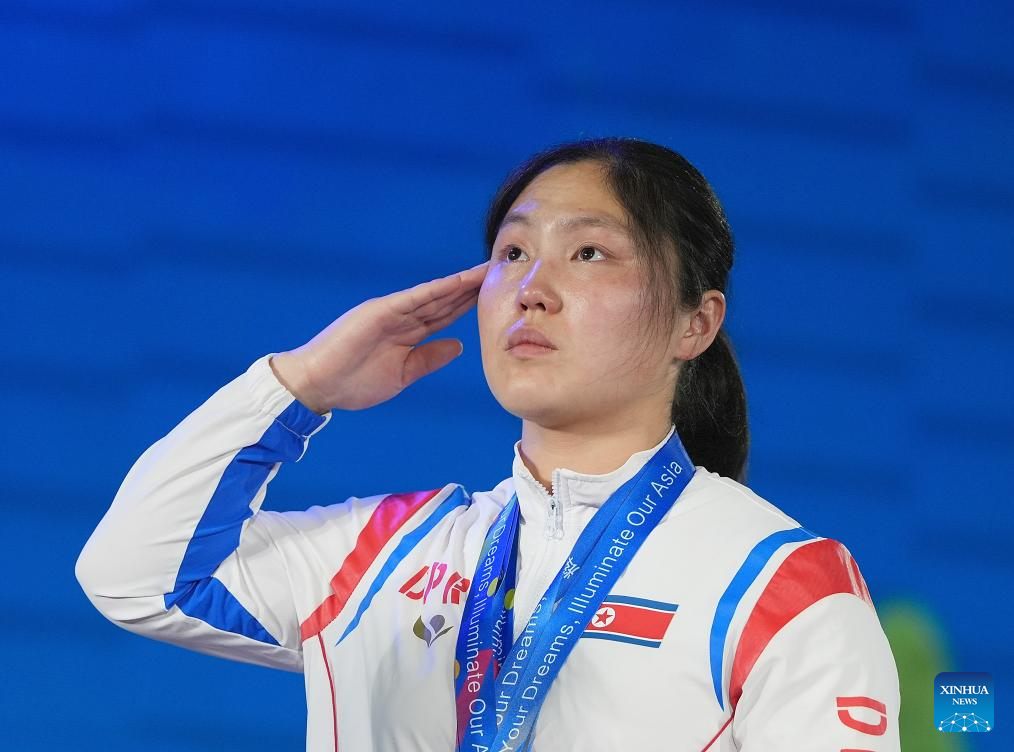 Total gold medalist Kim Il Gyong of the Democratic People's Republic of Korea (DPRK) reacts during the awarding ceremony for the women's 59kg competition at 2025 Asian Weightlifting Championships in Jiangshan, east China's Zhejiang Province, May 11, 2025. (Xinhua/Hou Zhaokang)