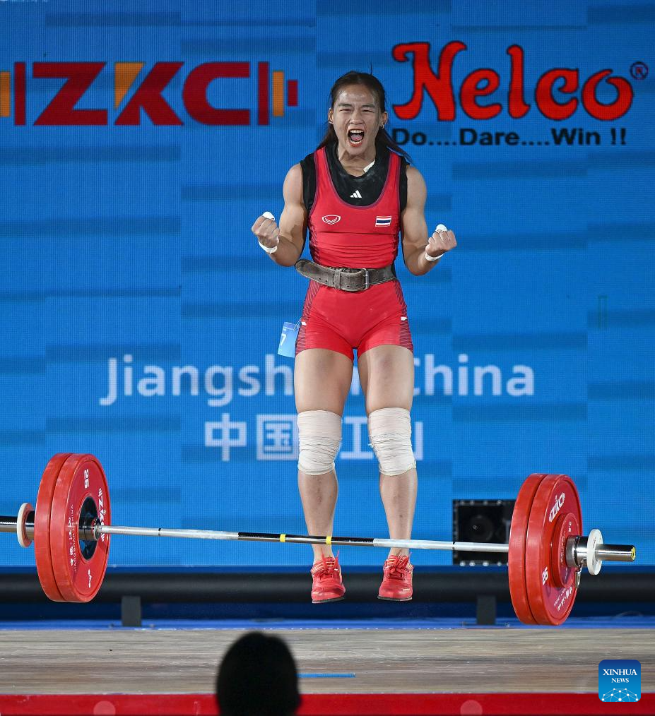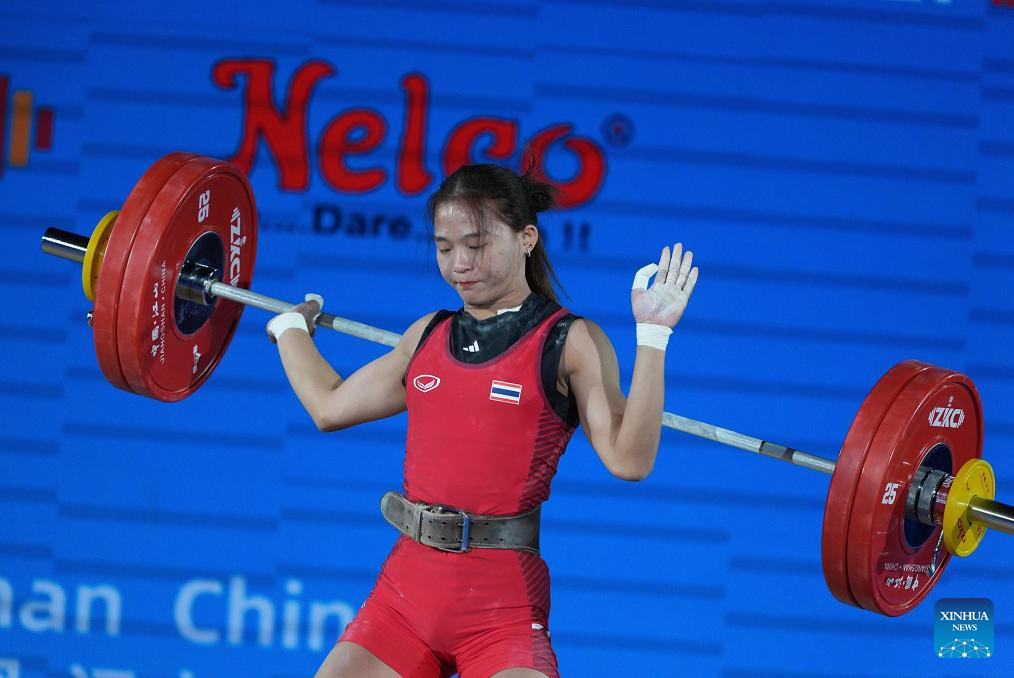 Suratwadee Yodsarn of Thailand reacts during the women's 59kg competition at 2025 Asian Weightlifting Championships in Jiangshan, east China's Zhejiang Province, May 11, 2025. (Xinhua/Hou Zhaokang)