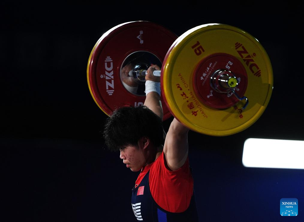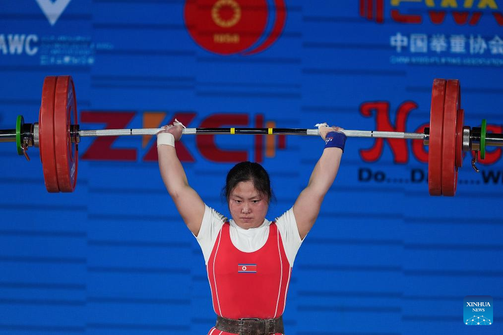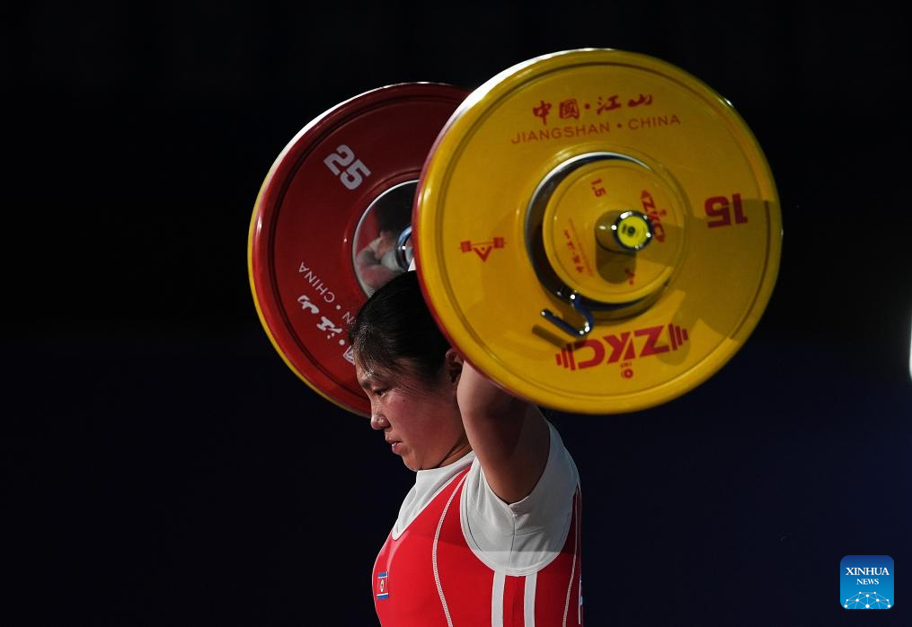 Kim Il Gyong of the Democratic People's Republic of Korea (DPRK) competes during the women's 59kg competition at 2025 Asian Weightlifting Championships in Jiangshan, east China's Zhejiang Province, May 11, 2025. (Xinhua/Hou Zhaokang)