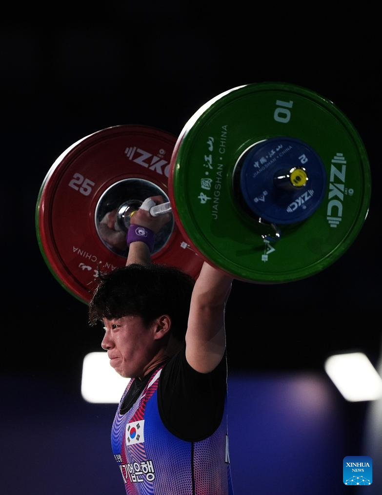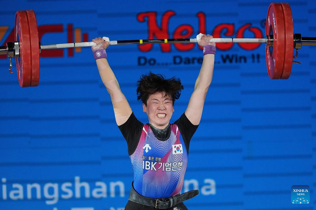 Mun Minhee of South Korea competes during the women's 64kg competition at 2025 Asian Weightlifting Championships in Jiangshan, east China's Zhejiang Province, May 11, 2025. (Xinhua/Hou Zhaokang)