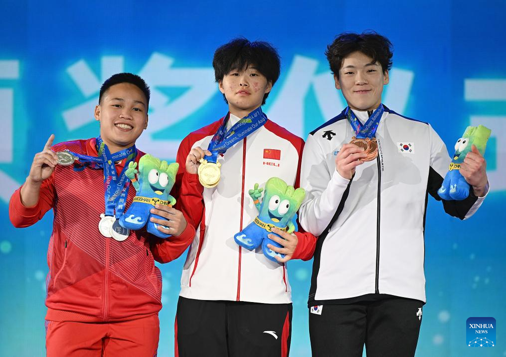 Total gold medalist Li Shuang of China (C), silver medalist Elreen Ann Ando (L) of the Philippines and bronze medalist Mun Minhee of South Korea pose during the awarding ceremony for the women's 64kg competition at 2025 Asian Weightlifting Championships in Jiangshan, east China's Zhejiang Province, May 11, 2025. (Xinhua/Hou Zhaokang)