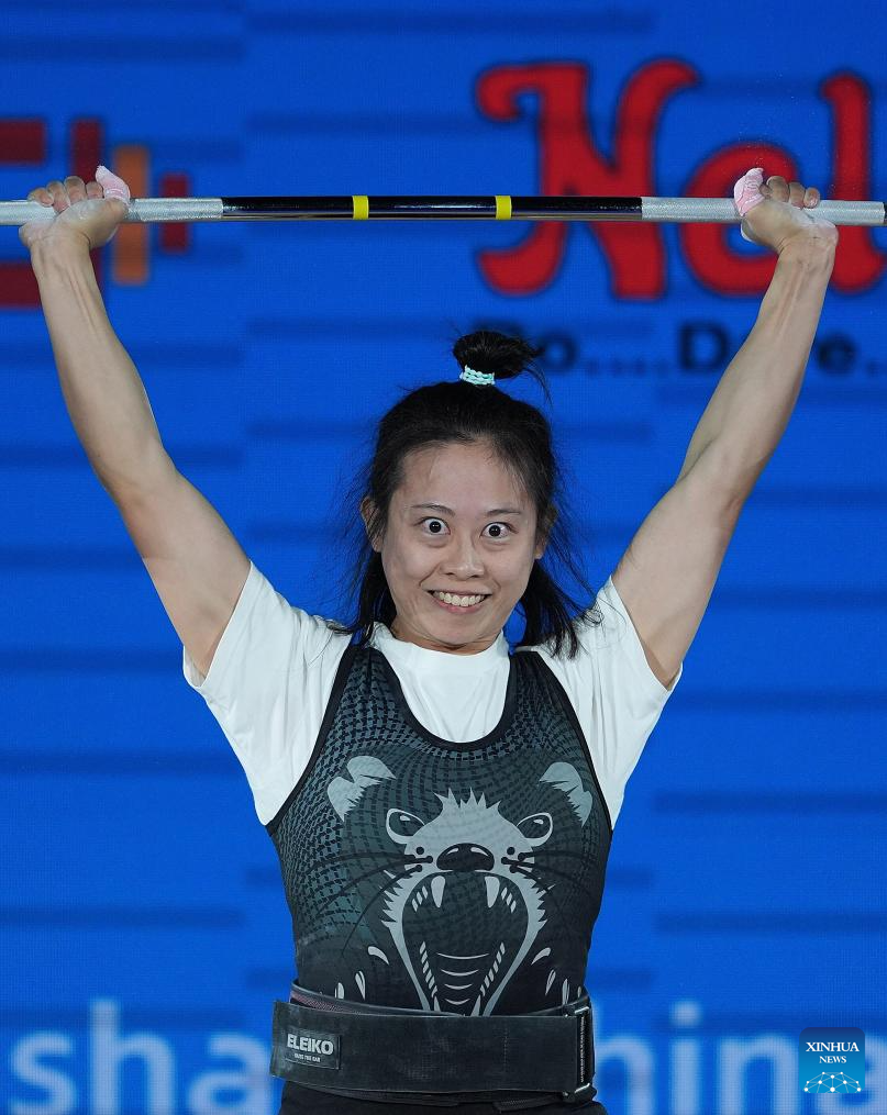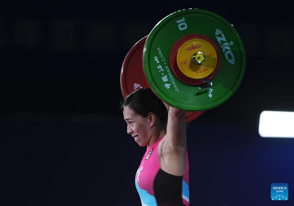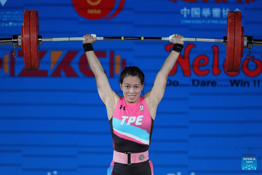 Kuo Hsing-Chun of Chinese Taipei competes during the women's 59kg competition at 2025 Asian Weightlifting Championships in Jiangshan, east China's Zhejiang Province, May 11, 2025. (Xinhua/Hou Zhaokang)