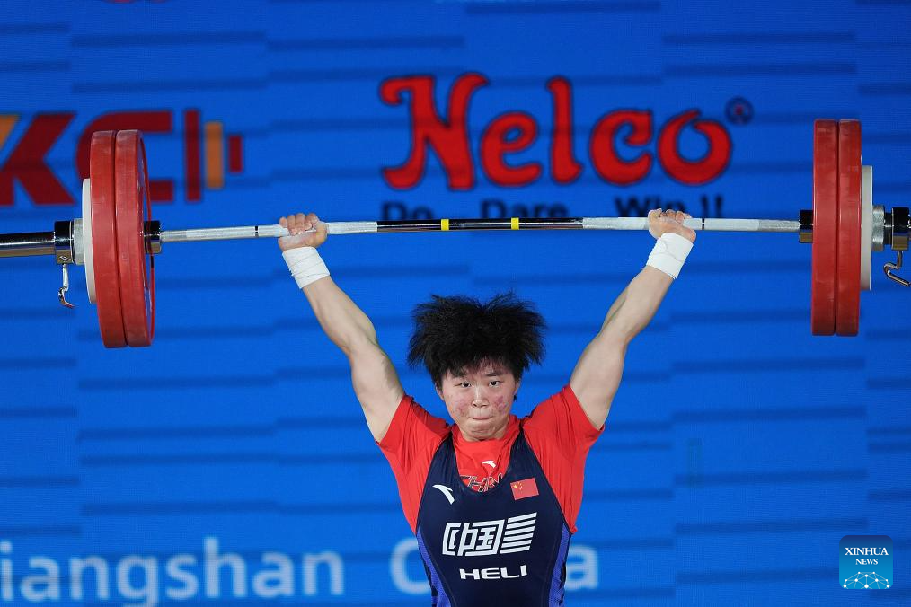 Li Shuang of China competes during the women's 64kg competition at 2025 Asian Weightlifting Championships in Jiangshan, east China's Zhejiang Province, May 11, 2025. (Xinhua/Hou Zhaokang)