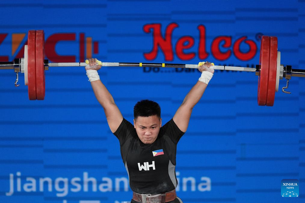 Elreen Ann Ando of the Philippines competes during the women's 64kg competition at 2025 Asian Weightlifting Championships in Jiangshan, east China's Zhejiang Province, May 11, 2025. (Xinhua/Hou Zhaokang)