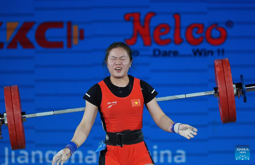 Quang Thi Tam of Vietnam fails to lift during the women's 59kg competition at 2025 Asian Weightlifting Championships in Jiangshan, east China's Zhejiang Province, May 11, 2025. (Xinhua/Hou Zhaokang)