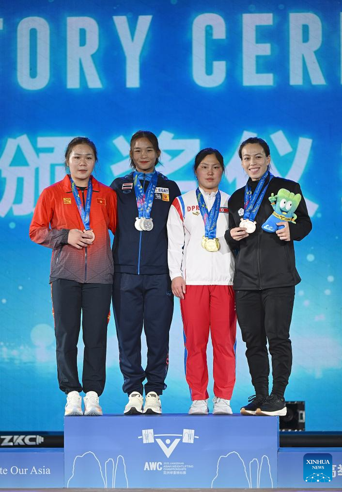 Total gold medalist Kim Il Gyong (2nd R) of the Democratic People's Republic of Korea (DPRK), silver medalist Suratwadee Yodsarn (2nd L) of Thailand, bronze medalist Kuo Hsing-Chun (1st R) of Chinese Taipei and bronze medalist for snatch Quang Thi Tam of Vietnam pose for photos during the awarding ceremony for the women's 59kg competition at 2025 Asian Weightlifting Championships in Jiangshan, east China's Zhejiang Province, May 11, 2025. (Xinhua/Hou Zhaokang)