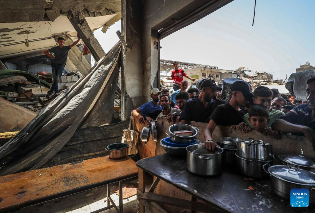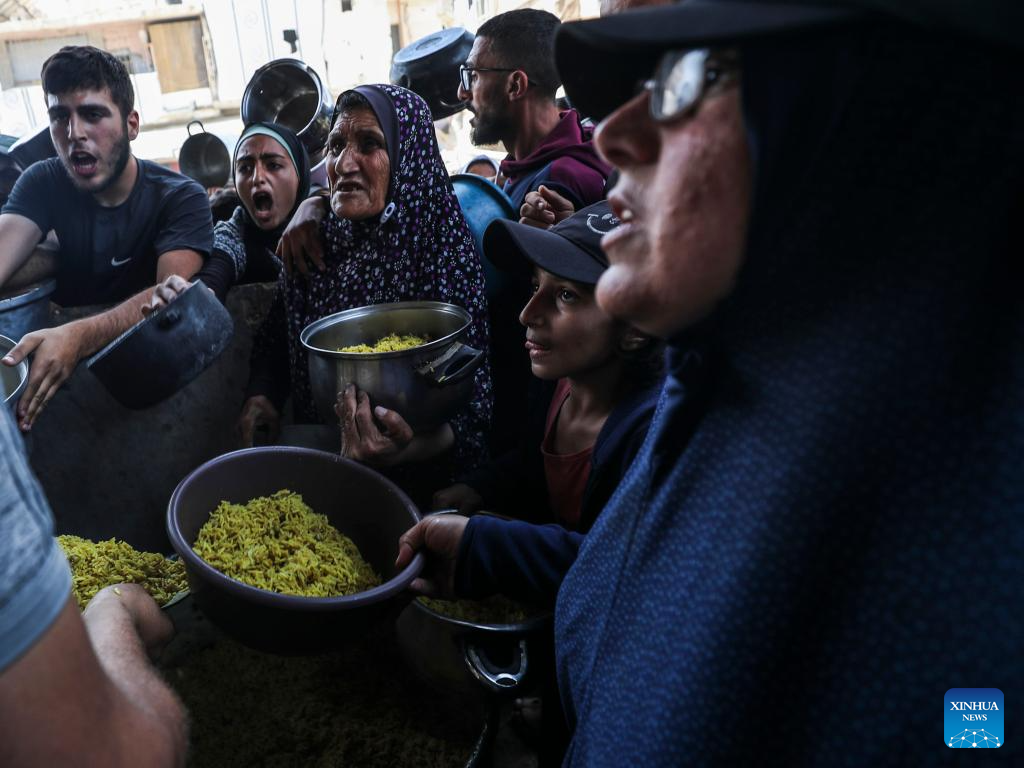 Palestinians receive free food from a food distribution center in the Jabalia refugee camp, northern Gaza Strip, May 11, 2025. (Photo by Mahmoud Zaki/Xinhua)