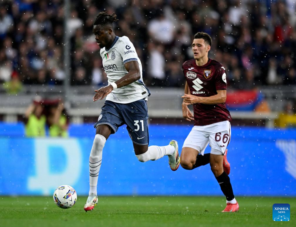 Inter Milan's Yann Bisseck (L) vies with Torino's Gvidas Gineitis during a Serie A soccer match between Torino and Inter Milan in Turin, Italy, May 11, 2025. (Xinhua)
