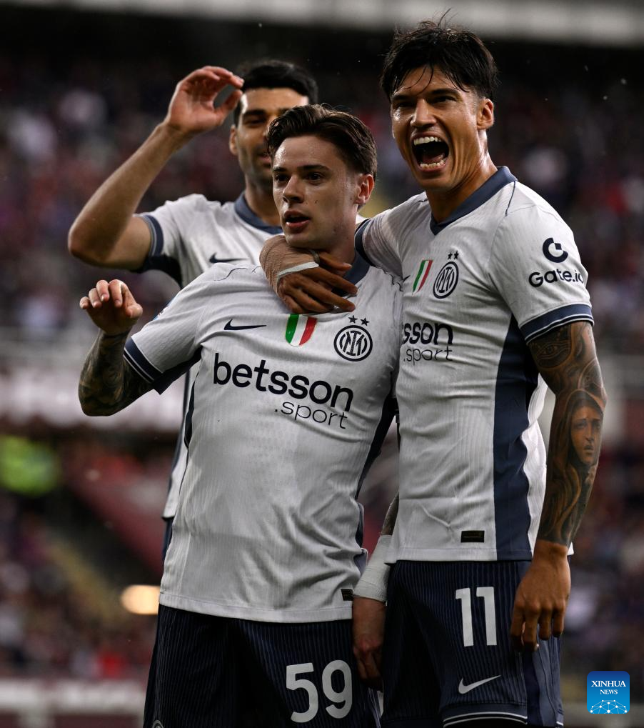 Inter Milan's Nicola Zalewski (C) celebrates his goal with his teammates during a Serie A soccer match between Torino and Inter Milan in Turin, Italy, May 11, 2025. (Xinhua)