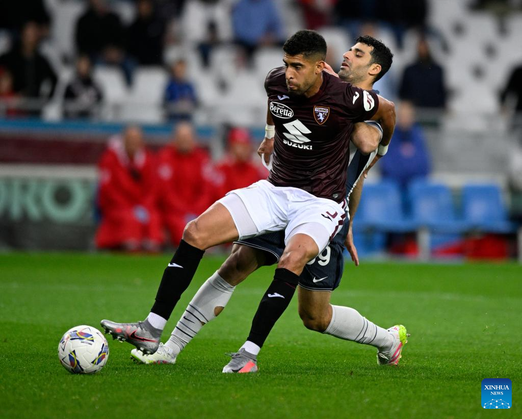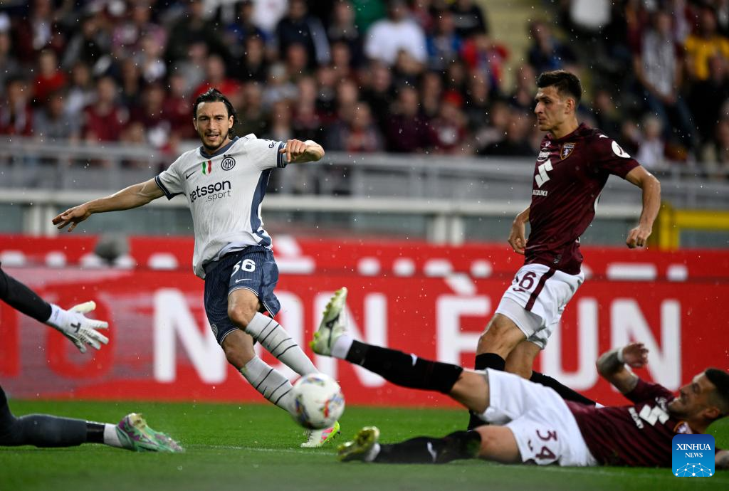 Inter Milan's Mehdi Taremi (R) vies with Torino's Adam Masina during a Serie A soccer match between Torino and Inter Milan in Turin, Italy, May 11, 2025. (Xinhua)