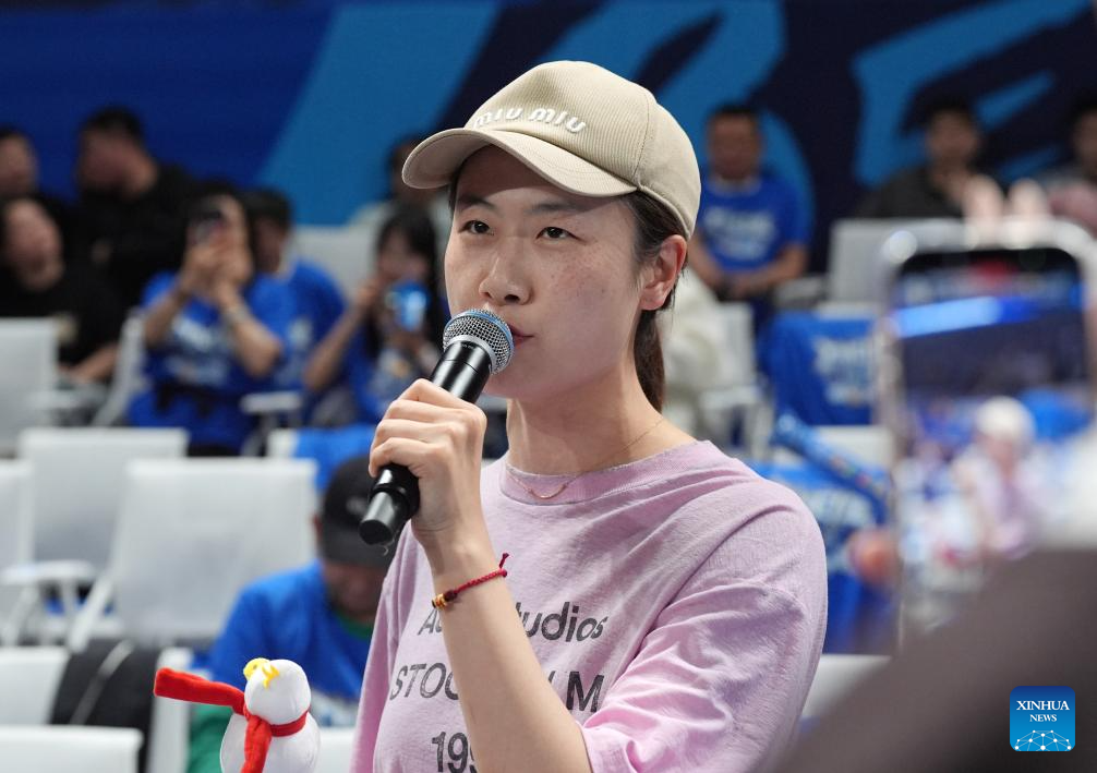 Former table tennis player Ding Ning cheer for Beijing Ducks before the playoff final 4th round match between Zhejiang Lions and Beijing Ducks at the 2024-2025 season of the Chinese Basketball Association (CBA) league in Beijing, capital of China, May 14, 2025. (Xinhua/Zhang Chenlin)