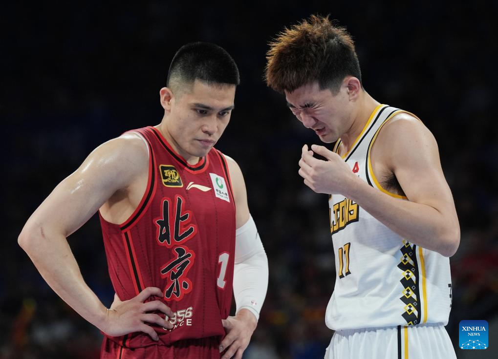 Chen Yingjun (L) of Beijing Ducks reacts as Sun Minghui of Zhejiang Lions grimaces after his eyes getting injured during the playoff final 4th round match between Zhejiang Lions and Beijing Ducks at the 2024-2025 season of the Chinese Basketball Association (CBA) league in Beijing, capital of China, May 14, 2025. (Xinhua/Zhang Chenlin)