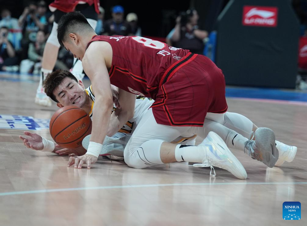 Fan Ziming (L) of Beijing Ducks vies with Hu Jinqiu of Zhejiang Lions during the playoff final 4th round match between Zhejiang Lions and Beijing Ducks at the 2024-2025 season of the Chinese Basketball Association (CBA) league in Beijing, capital of China, May 14, 2025. (Xinhua/Zhang Chenlin)