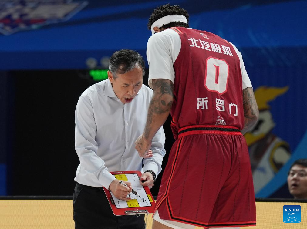 Head coach of Beijing Ducks Xu Limin (L) gives instructions to player Richard Solomon during the playoff final 4th round match between Zhejiang Lions and Beijing Ducks at the 2024-2025 season of the Chinese Basketball Association (CBA) league in Beijing, capital of China, May 14, 2025. (Xinhua/Zhang Chenlin)