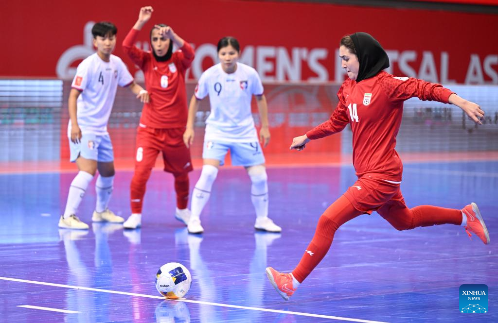 Maral Torkaman (R) of Iran scores from a penalty-kick during the quarterfinal match between Chinese Taipei and Iran at AFC Women's Futsal Asian Cup 2025 in Hohhot, north China's Inner Mongolia Autonomous Region, May 13, 2025. (Xinhua/Bei He)