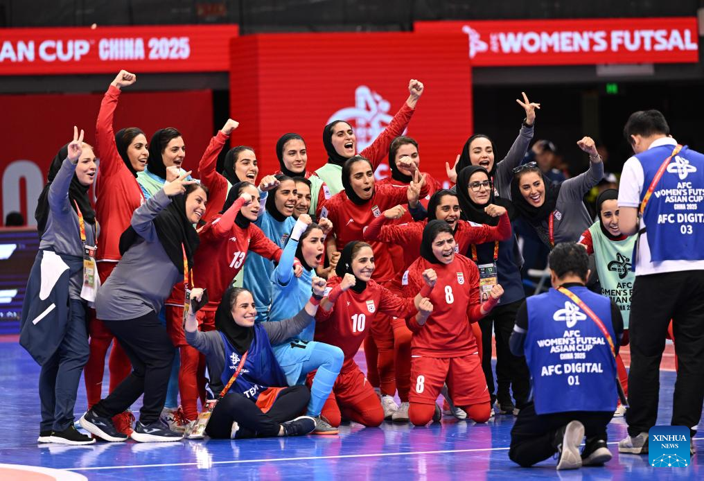 Players of Iran celebrate a goal during the quarterfinal match between Chinese Taipei and Iran at AFC Women's Futsal Asian Cup 2025 in Hohhot, north China's Inner Mongolia Autonomous Region, May 13, 2025. (Xinhua/Bei He)