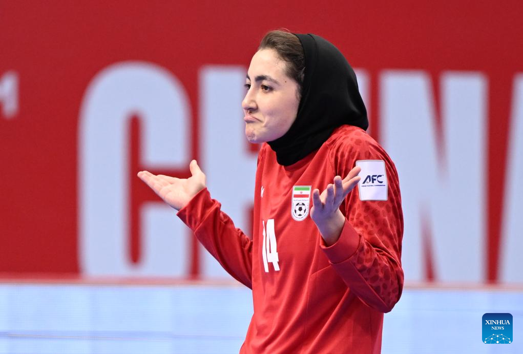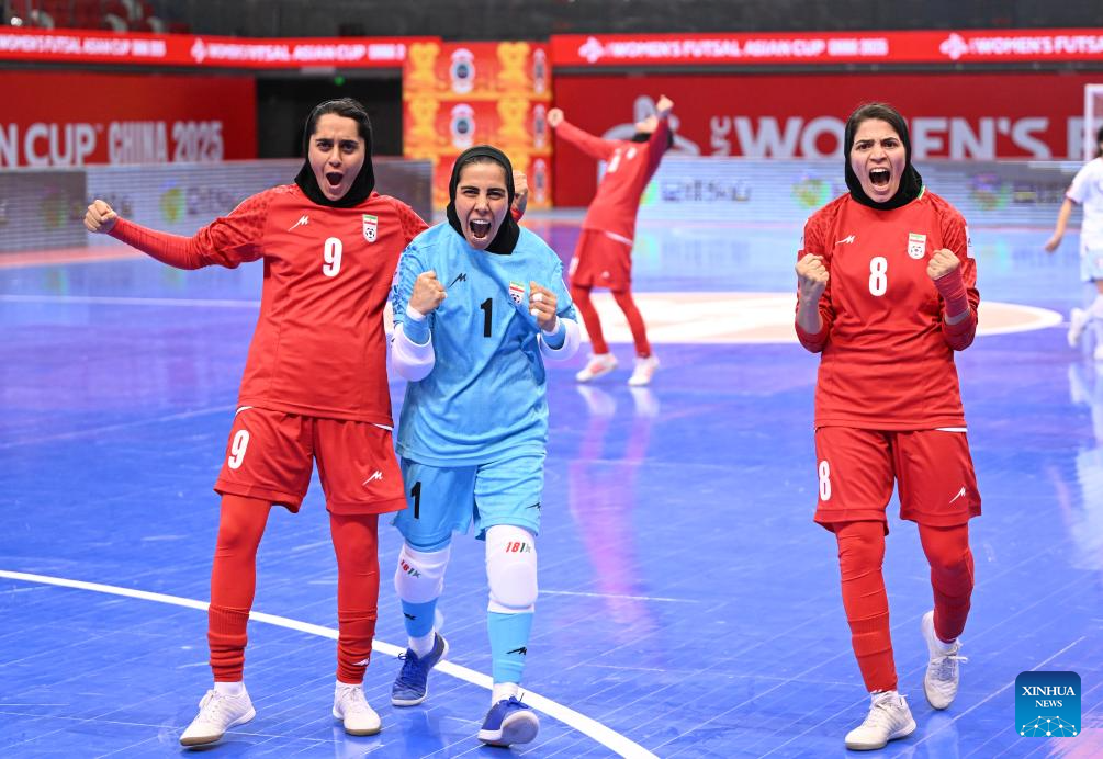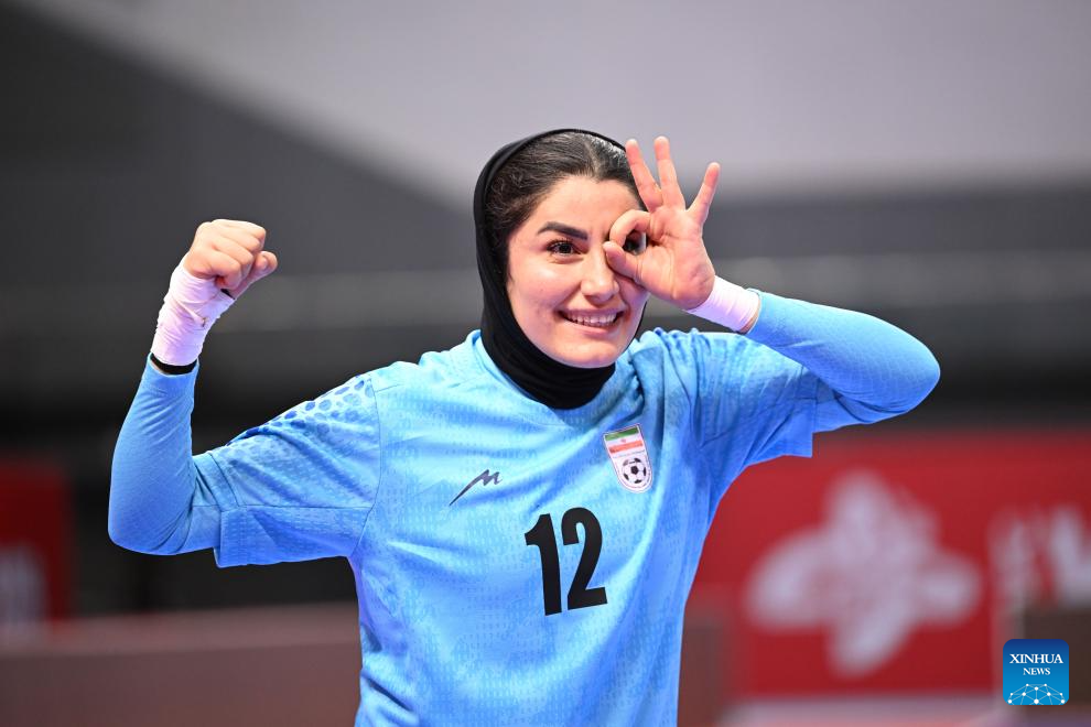 Tahereh Mehdi Pour of Iran celebrates after the quarterfinal match between Chinese Taipei and Iran at AFC Women's Futsal Asian Cup 2025 in Hohhot, north China's Inner Mongolia Autonomous Region, May 13, 2025. (Xinhua/Bei He)