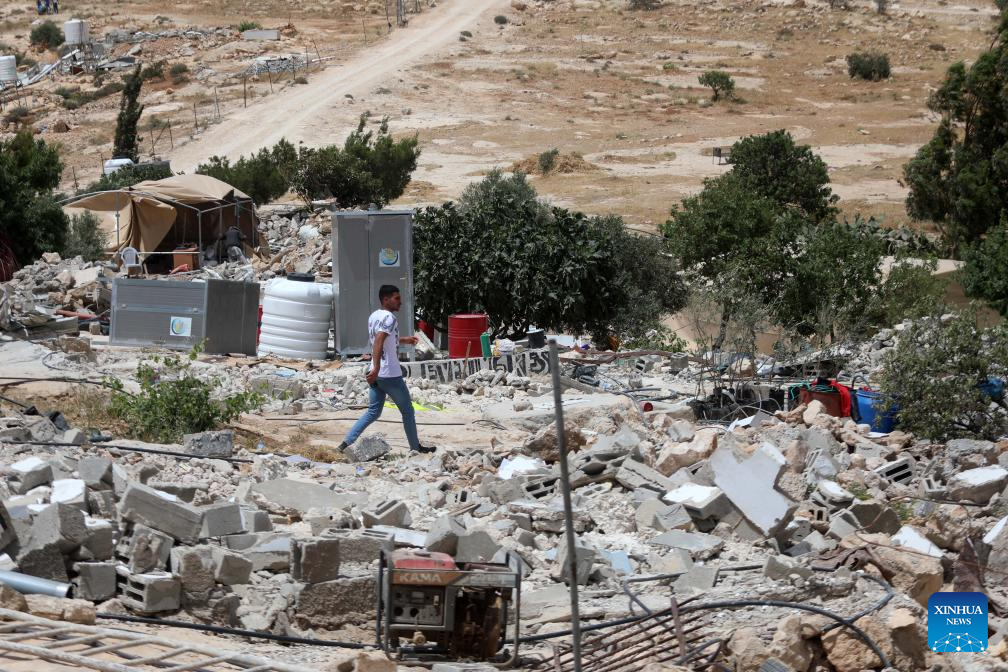 A man walks among rubble after the Israeli forces demolished the structures in the village of Khallet al-Dabaa in Masafer Yatta, southern West Bank city of Hebron, on May 12, 2025. (Photo by Mamoun Wazwaz/Xinhua)