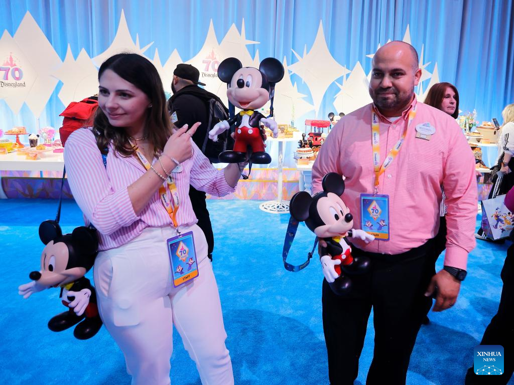 Staff introduce new souvenirs for Disneyland Resort's 70th anniversary celebrations at Disney California Adventure Park in Anaheim, California, the United States, on May 13, 2025. Disneyland Resort in U.S. California launches its 70th anniversary celebration this week with a host of special events, new attractions, vibrant decorations, themed food and beverages, and commemorative merchandise. (Photo by Qiu Chen/Xinhua)