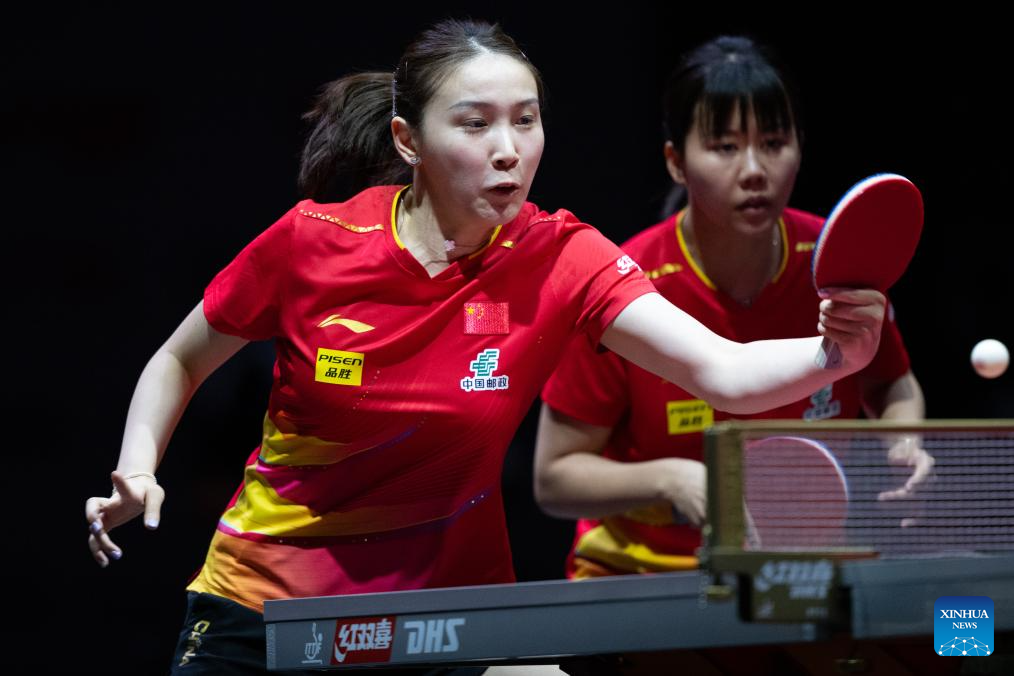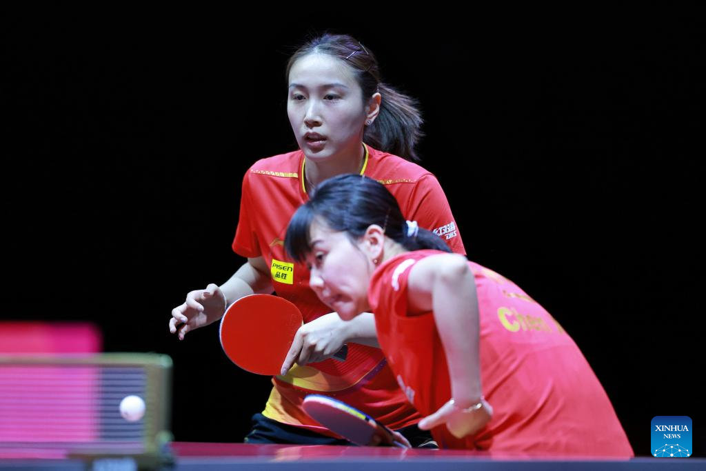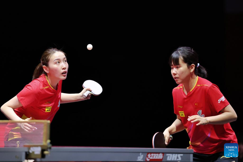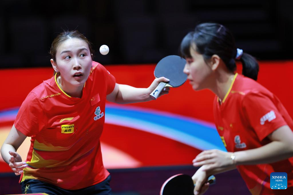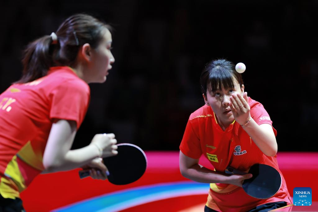 Chen Xingtong/Qian Tianyi (L) compete during the women's doubles round of 64 match between Chen Xingtong/Qian Tianyi of China and Daniela Fonseca/Estela Crespo of Cuba at ITTF World Table Tennis Championships Finals Doha 2025 in Doha, Qatar, May 18, 2025. (Xinhua/Liu Xu)