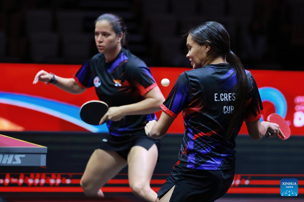 Daniela Fonseca/Estela Crespo(R) compete during the women's doubles round of 64 match between Chen Xingtong/Qian Tianyi of China and Daniela Fonseca/Estela Crespo of Cuba at ITTF World Table Tennis Championships Finals Doha 2025 in Doha, Qatar, May 18, 2025. (Xinhua/Liu Xu)