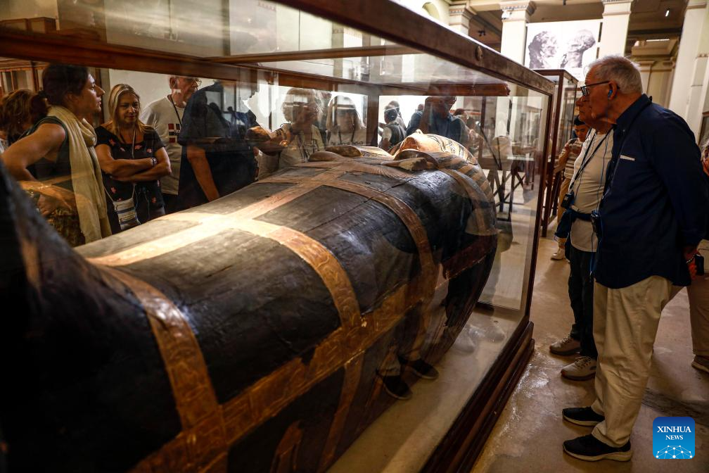 Visitors view a mummy coffin at the Egyptian Museum in Cairo, Egypt, May 18, 2025. International Museum Day, observed every year on May 18, is a global celebration recognized by the International Council of Museums. (Xinhua/Ahmed Gomaa)