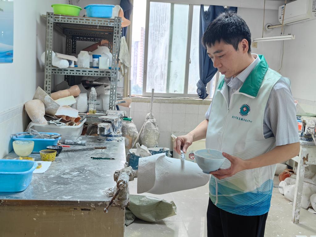 Zhang Wei, head of the department of assistive rehabilitation devices at the Chongqing Civil Affairs Hospital of Integrated Traditional Chinese and Western Medicine, shapes a mold for a prosthetic limb at the hospital in southwest China's Chongqing Municipality, May 16, 2025.(Xinhua/Wu Mengtong)