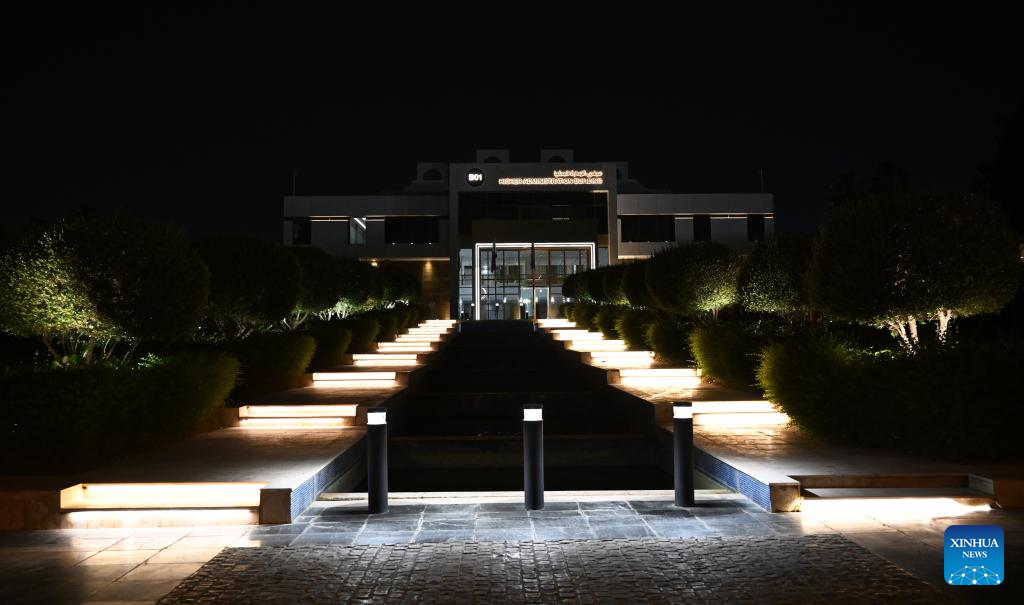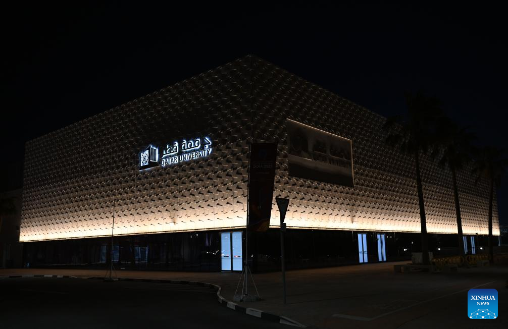 This photo taken on May 18, 2025 shows a night view of Qatar University. Qatar University Gymnasium is the competition venue of ITTF World Table Tennis Championships Finals Doha 2025. The ITTF World Table Tennis Championships Finals Doha 2025 is held in Doha, Qatar, form May 17 to 25, 2025. (Xinhua/He Changshan)