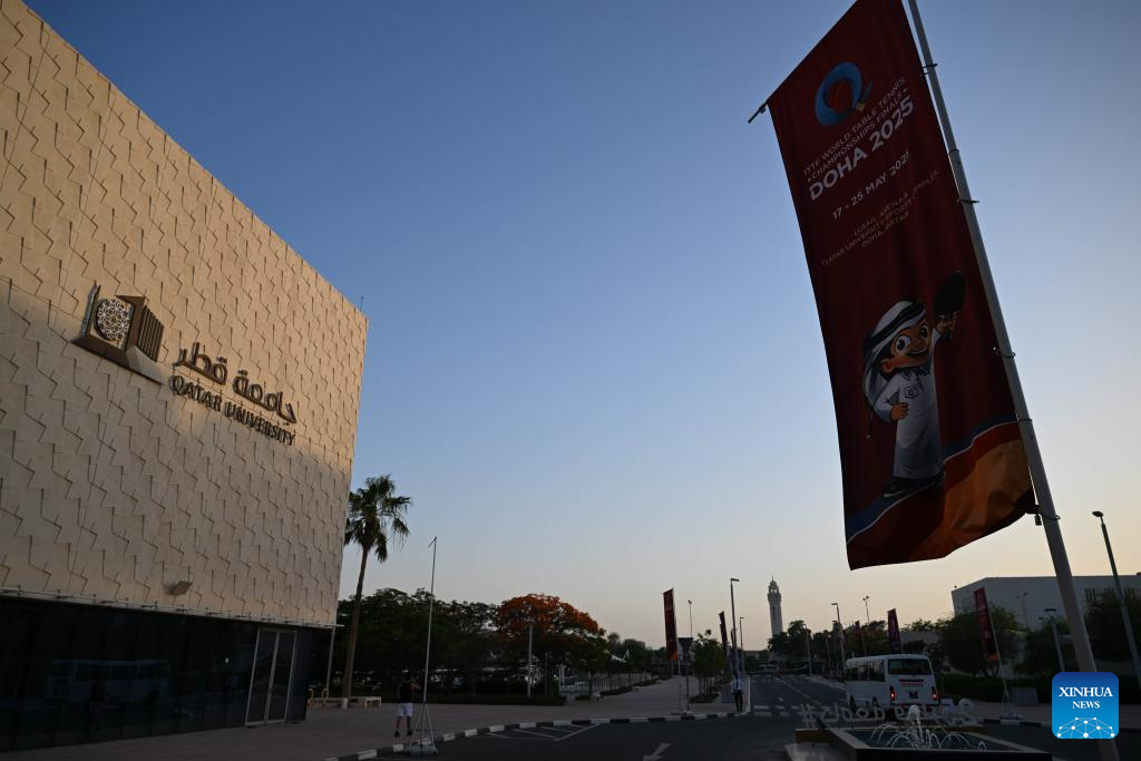 This photo taken on May 18, 2025 shows an outside view of Qatar University Gymnasium which is the competition venue of ITTF World Table Tennis Championships Finals Doha 2025. The ITTF World Table Tennis Championships Finals Doha 2025 is held in Doha, Qatar, form May 17 to 25, 2025. (Xinhua/He Changshan)