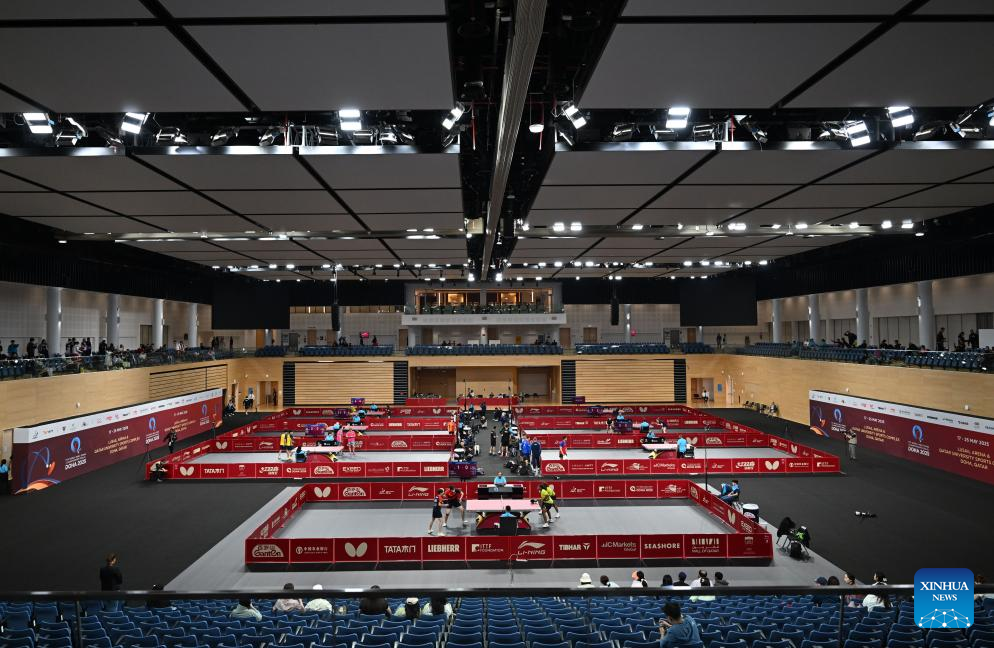 This photo taken on May 18, 2025 shows an inner view of Qatar University Gymnasium which is the competition venue of ITTF World Table Tennis Championships Finals Doha 2025. The ITTF World Table Tennis Championships Finals Doha 2025 is held in Doha, Qatar, form May 17 to 25, 2025. (Xinhua/He Changshan)