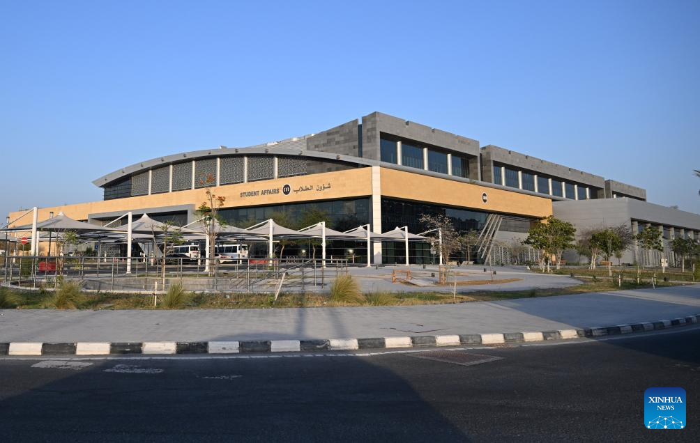 This photo taken on May 18, 2025 shows an outside view of Qatar University. Qatar University Gymnasium is the competition venue of ITTF World Table Tennis Championships Finals Doha 2025. The ITTF World Table Tennis Championships Finals Doha 2025 is held in Doha, Qatar, form May 17 to 25, 2025. (Xinhua/He Changshan)