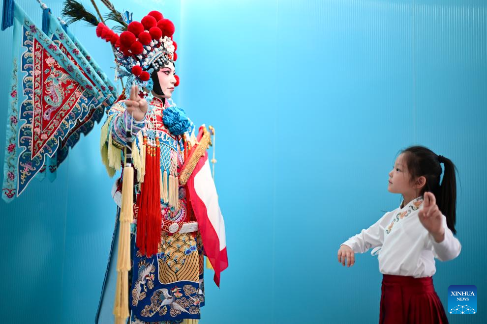 A girl imitates the gesture of a sculpture at a traditional opera museum in Kunshan, east China's Jiangsu Province, May 18, 2025. (Photo by Wang Xuzhong/Xinhua)