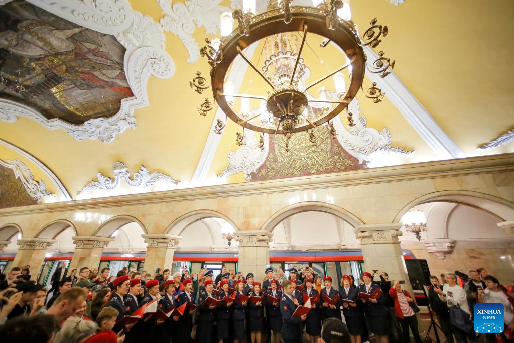 Metro employees sing during the parade of trains marking the 90th anniversary of the Moscow Metro in Moscow, Russia, on May 17, 2025. (Photo by Alexander Zemlianichenko Jr/Xinhua)