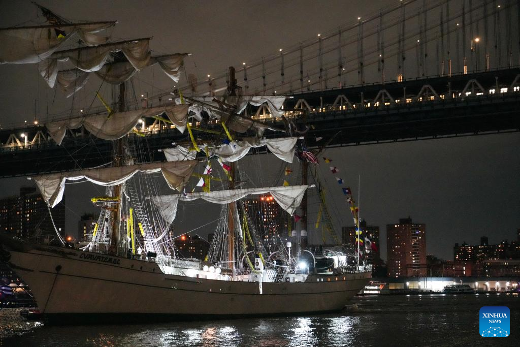 A massive Mexican navy sailing ship making a festive visit to New York hit the Brooklyn Bridge on Saturday evening, killing two people and injuring 19 others, New York City Mayor Eric Adams said. (Photo by Zack Zhang/Xinhua)