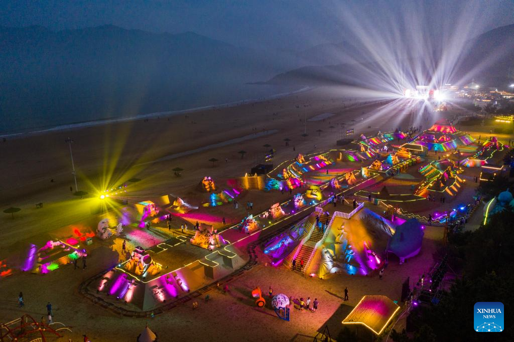 An aerial drone photo taken on May 17, 2025 shows the exhibition area of the 26th Zhoushan International Sand Sculpture Festival at night in Zhoushan, east China's Zhejiang Province. (Xinhua/Xu Yu)