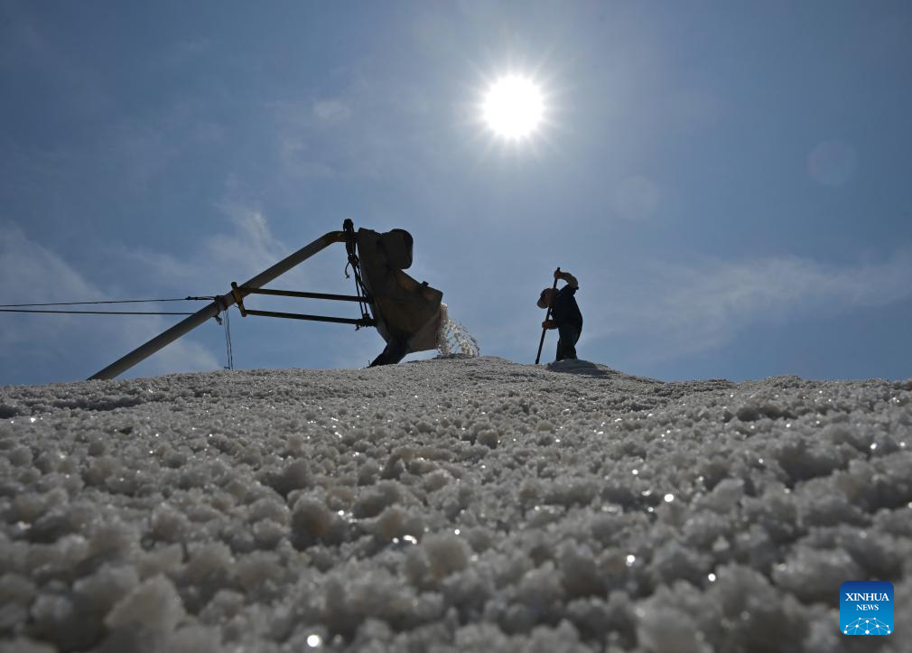 A worker works in a salt field in Tangshan, north China's Hebei Province, May 18, 2025. (Xinhua/Yang Shiyao)