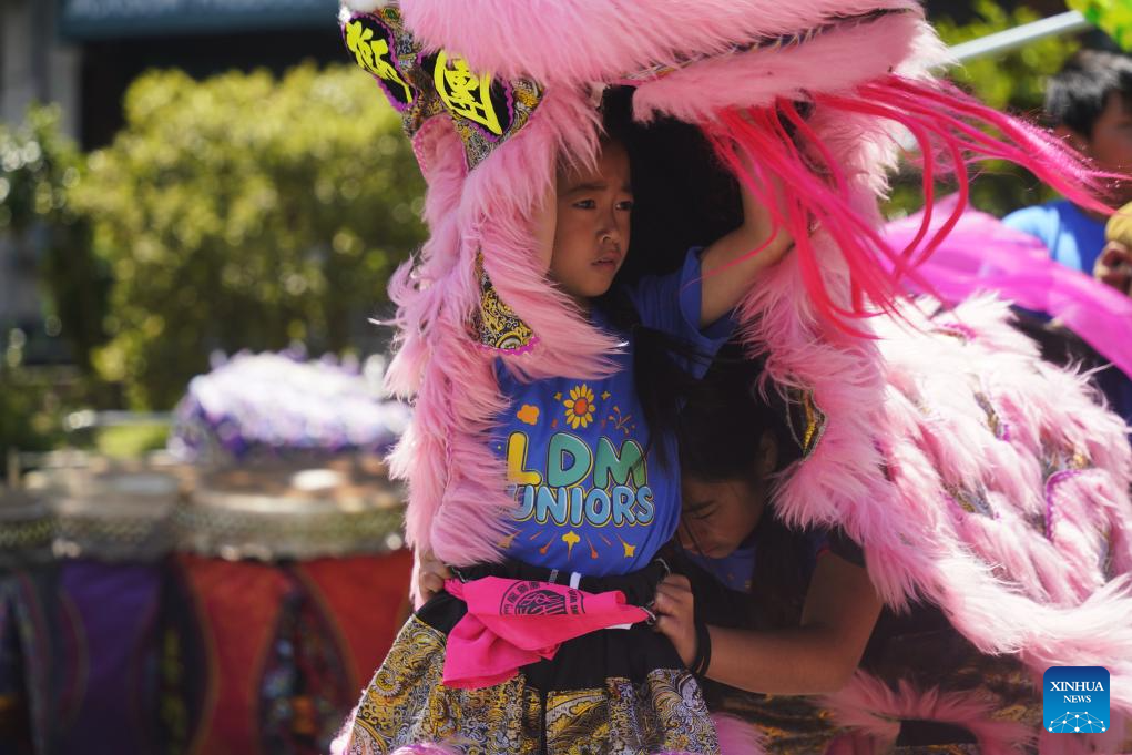 Boys perform lion dance during the award ceremony of a dragon and lion dance competition in San Francisco, California, the United States, May 17, 2025. (Xinhua/Wu Xiaoling)