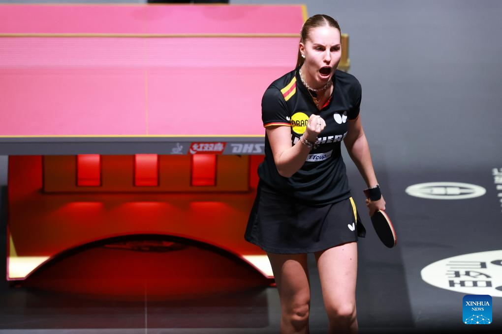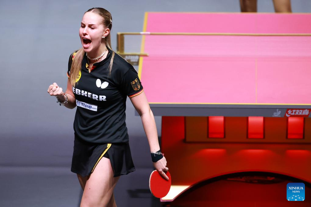 Annett Kaufmann celebrates scoring during the women's singles round of 64 match between Chen Xingtong of China and Annett Kaufmann of Germany at ITTF World Table Tennis Championships Finals Doha 2025 in Doha, Qatar, May 20, 2025. (Xinhua/Liu Xu)