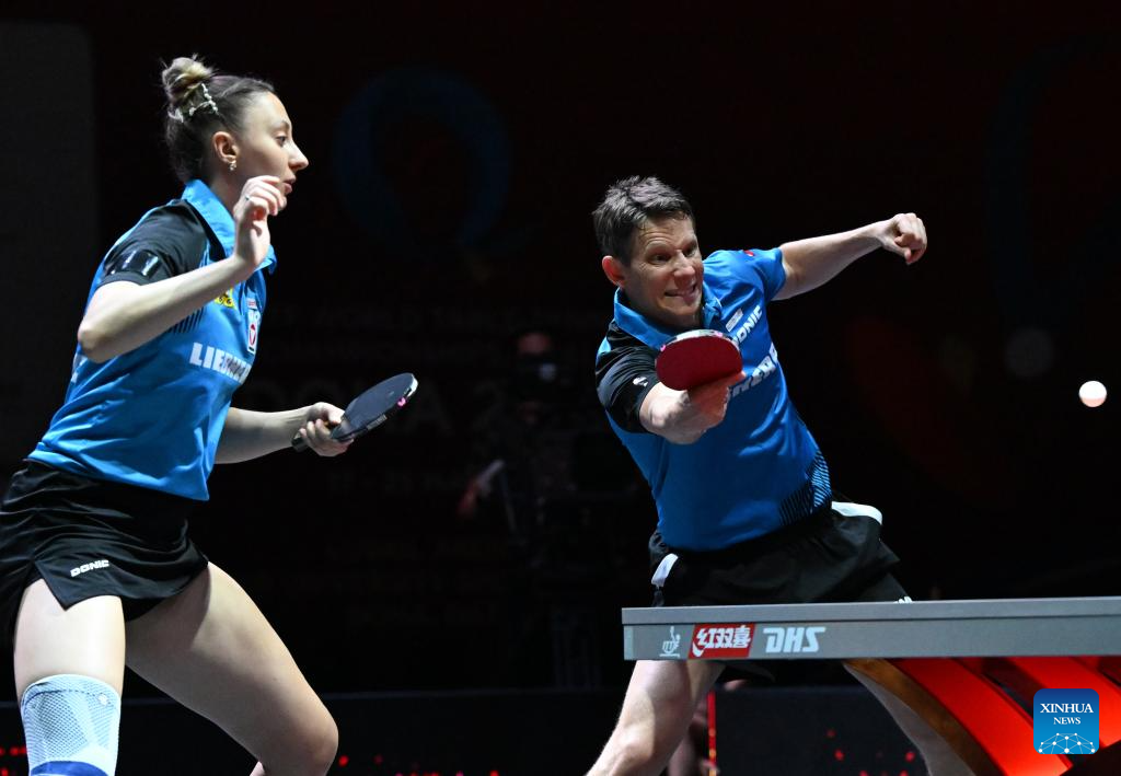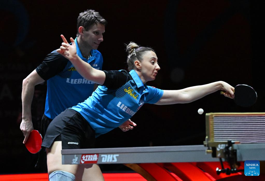 Robert Gardos/Sofia Polcanova (R) compete during the mixed doubles round of 16 match between Lin Shidong/Kuai Man of China and Robert Gardos/Sofia Polcanova of Austria at ITTF World Table Tennis Championships Finals Doha 2025 in Doha, Qatar, May 20, 2025. (Xinhua/He Changshan)