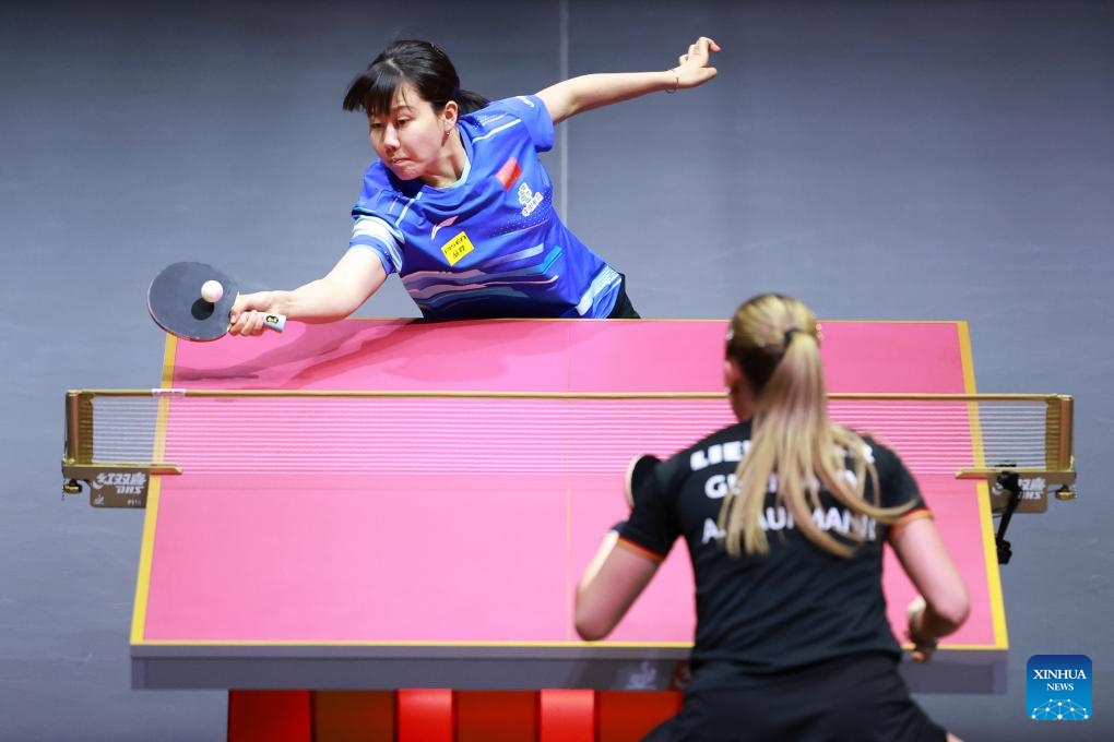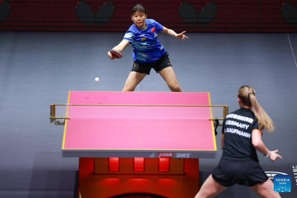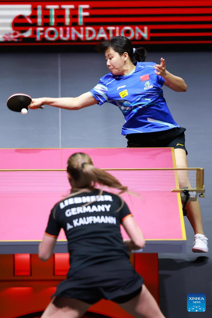 Chen Xingtong (L) hits a return during the women's singles round of 64 match between Chen Xingtong of China and Annett Kaufmann of Germany at ITTF World Table Tennis Championships Finals Doha 2025 in Doha, Qatar, May 20, 2025. (Xinhua/Liu Xu)