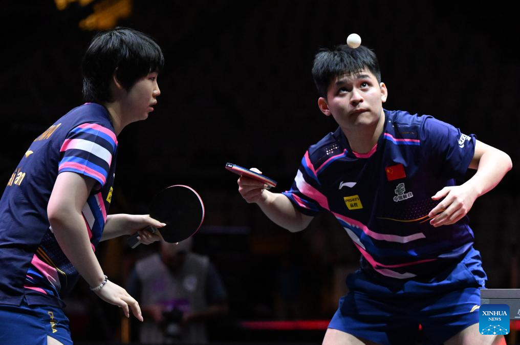 Lin Shidong (R)/Kuai Man compete during the mixed doubles round of 16 match between Lin Shidong/Kuai Man of China and Robert Gardos/Sofia Polcanova of Austria at ITTF World Table Tennis Championships Finals Doha 2025 in Doha, Qatar, May 20, 2025. (Xinhua/He Changshan)