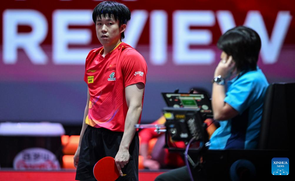 Wang Chuqin gestures for a "Hawk-Eye Challenge" during the men's singles round of 32 match between Wang Chuqin of China and Wong Chun Ting of China's Hong Kong at ITTF World Table Tennis Championships Finals Doha 2025 in Doha, Qatar, May 20, 2025. (Xinhua/He Changshan)